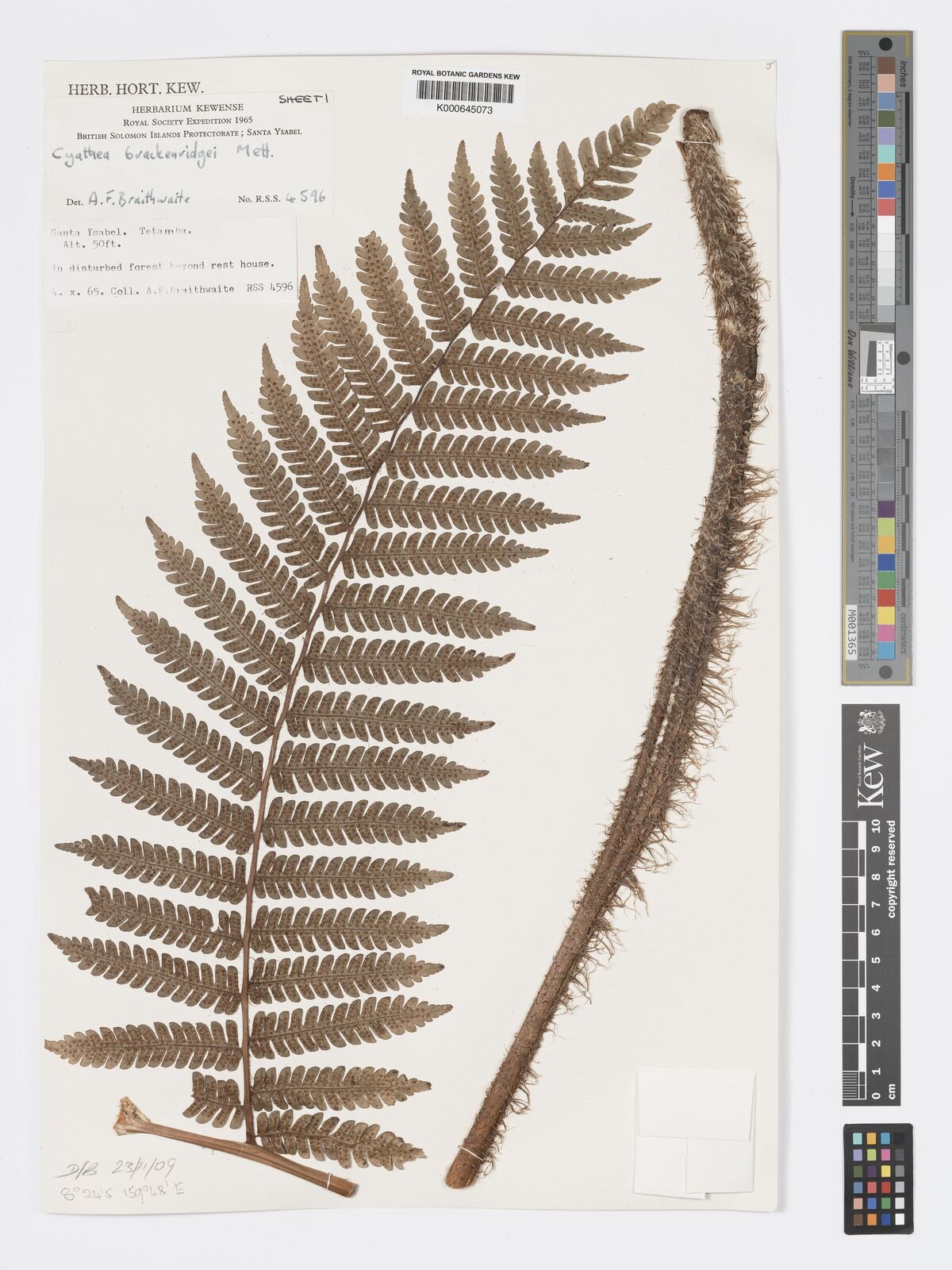 • Roskov Y. & al. (eds.) (2018). World Ferns: Checklist of Ferns and Lycophytes of the World. Species 2000 & ITIS Catalogue of Life Naturalis, Leiden, the Netherlands. [Cited as Cyathea brackenridgei.]