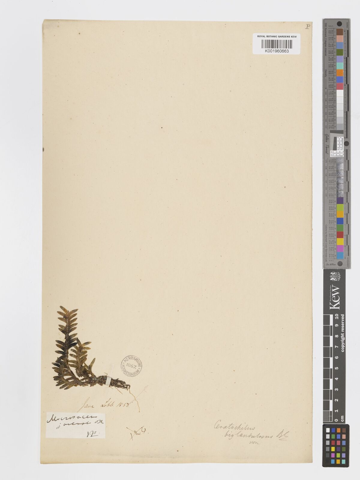 Epiphytic herbs. Stem up to 20 cm long, often curved, simple or branching, leafy, rooting at base. Leaves laterally flattened, distichously arranged, usually imbricate at base. Inflorescences arising from leaf axils, one- or two-flowered, often borne opposite one another; floral bracts linear and ovate. Flowers white, fleshy. Sepals and petals usually not widely spreading. Sepals usually free, laterals sometimes joined at base to and decurrent along spur. Petals free. Labellum firmly adnate to base of column, entire, emarginate or slightly bilobed, ecallose, pitcher-shaped and quadrangular in outline, oblong, spurred; spur globose or narrow and shallowly conical, sometimes transversely compressed, ecallose. Column foot absent; pollinia four, equal, stipe linear-clavate, 1.5–3.0 times the diameter of the pollinia, viscidium narrowly elliptic.