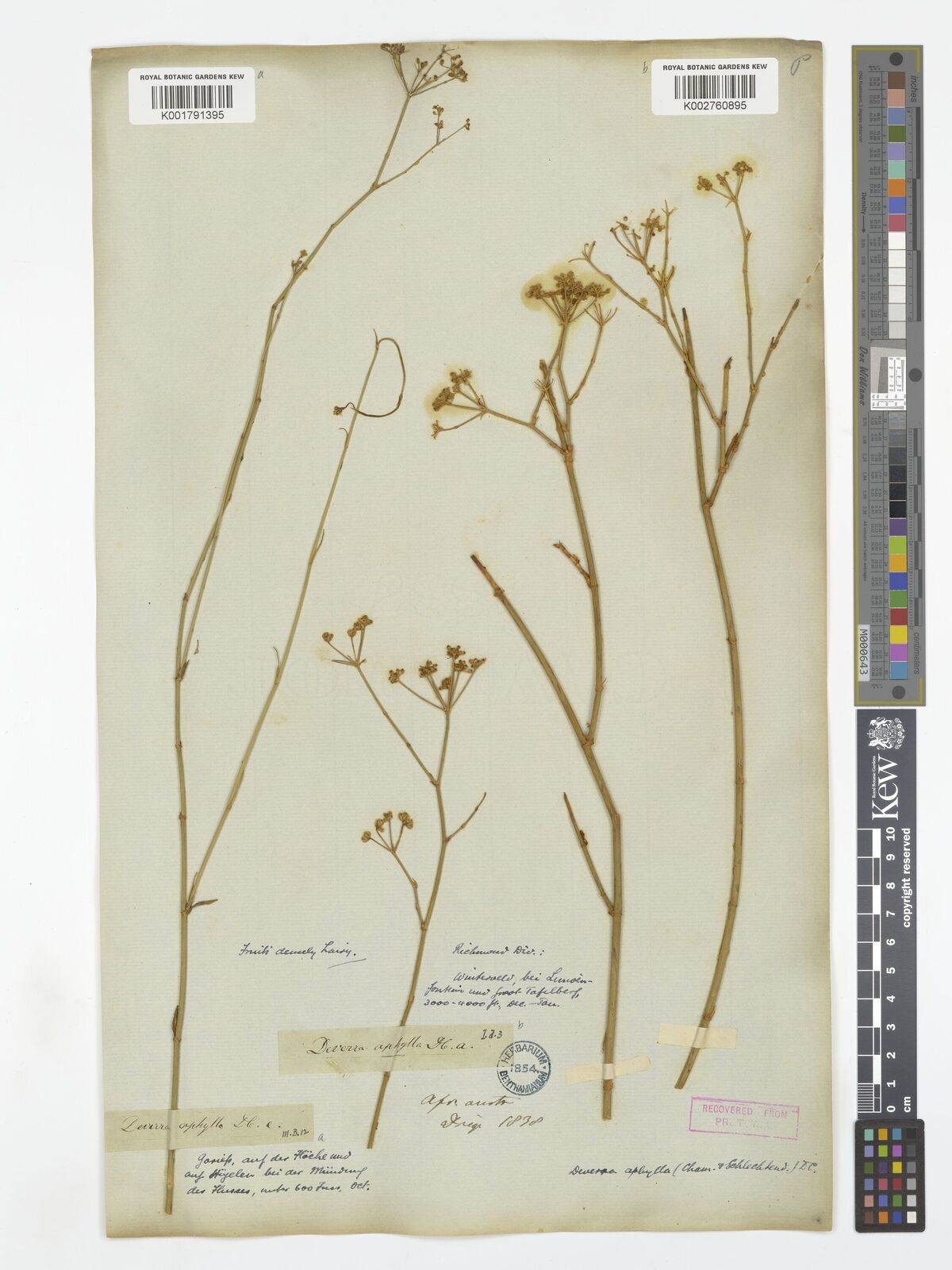 • Govaerts, R. (2000). World Checklist of Seed Plants Database in ACCESS Genera starting with letter D: 1-30141. [Cited as Deverra denudata subsp. aphylla.]