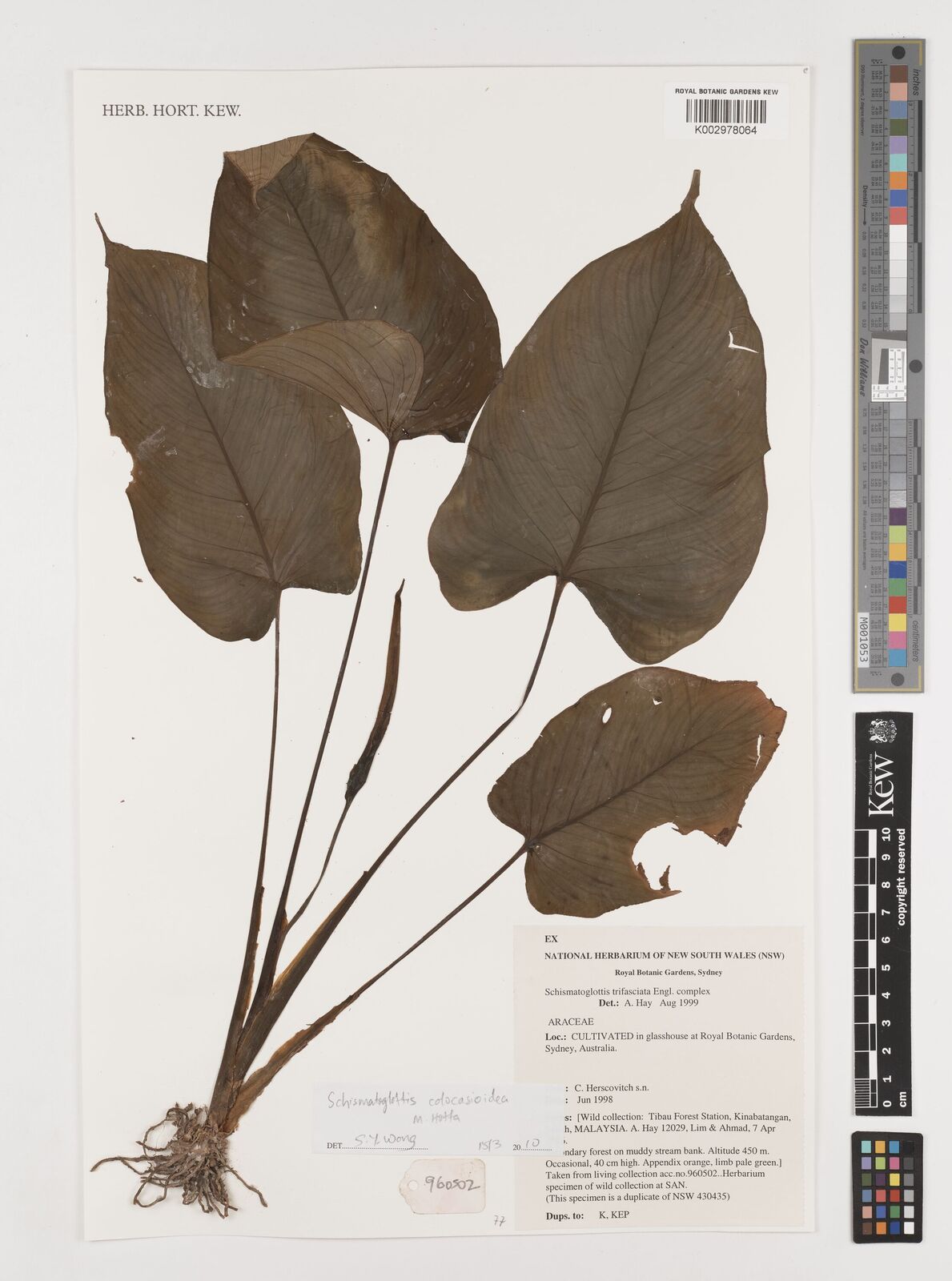 • Govaerts, R. & Frodin, D.G. (2002). World Checklist and Bibliography of Araceae (and Acoraceae): 1-560. The Board of Trustees of the Royal Botanic Gardens, Kew. [Cited as Schismatoglottis trifasciata.]